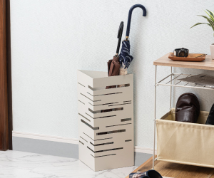 濡れた傘を立てても、底部には取り外し可能な透明な水受けトレイが付属しているため、水浸しになる心配がありません。 トレイに溜まった水はサッと捨てられ、お手入れも簡単。傘立て内部を清潔に保ち、床を汚しません。