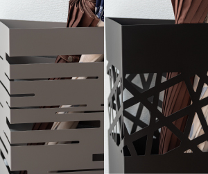 スリットは単なるデザインでなく、中の傘のデザインも把握しやすく、実用的な役割を果たします。 これにより、お気に入りの傘を迷わず取り出せます。 複雑な型抜きはスチールだからこそ表現でき、繊細で抜け感のあるデザインに仕上がっています。